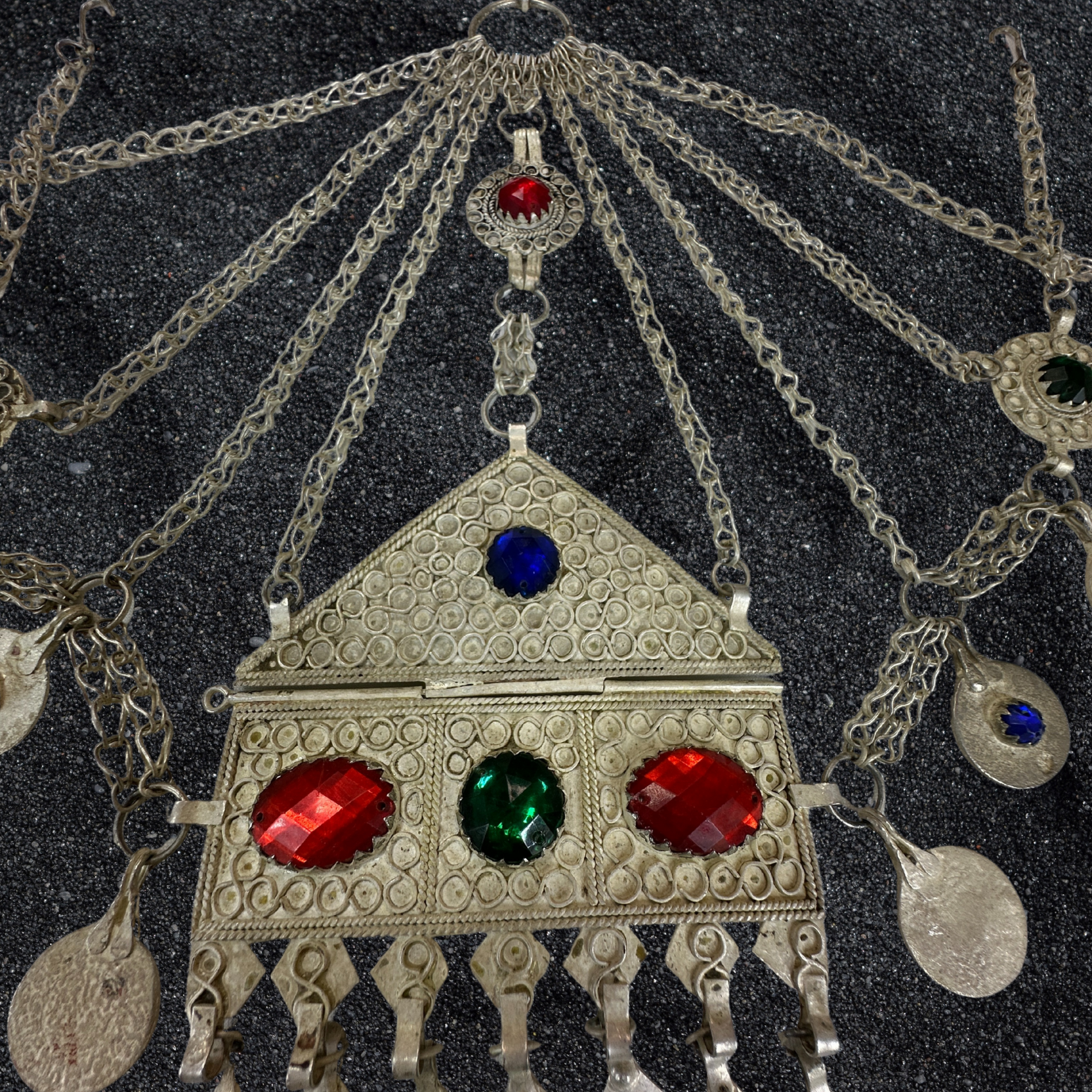 This masterpiece features intricate silver filigree work, vibrant colored glass stones (red, green, blue), and delicate dangling coins that shimmer with every movement.